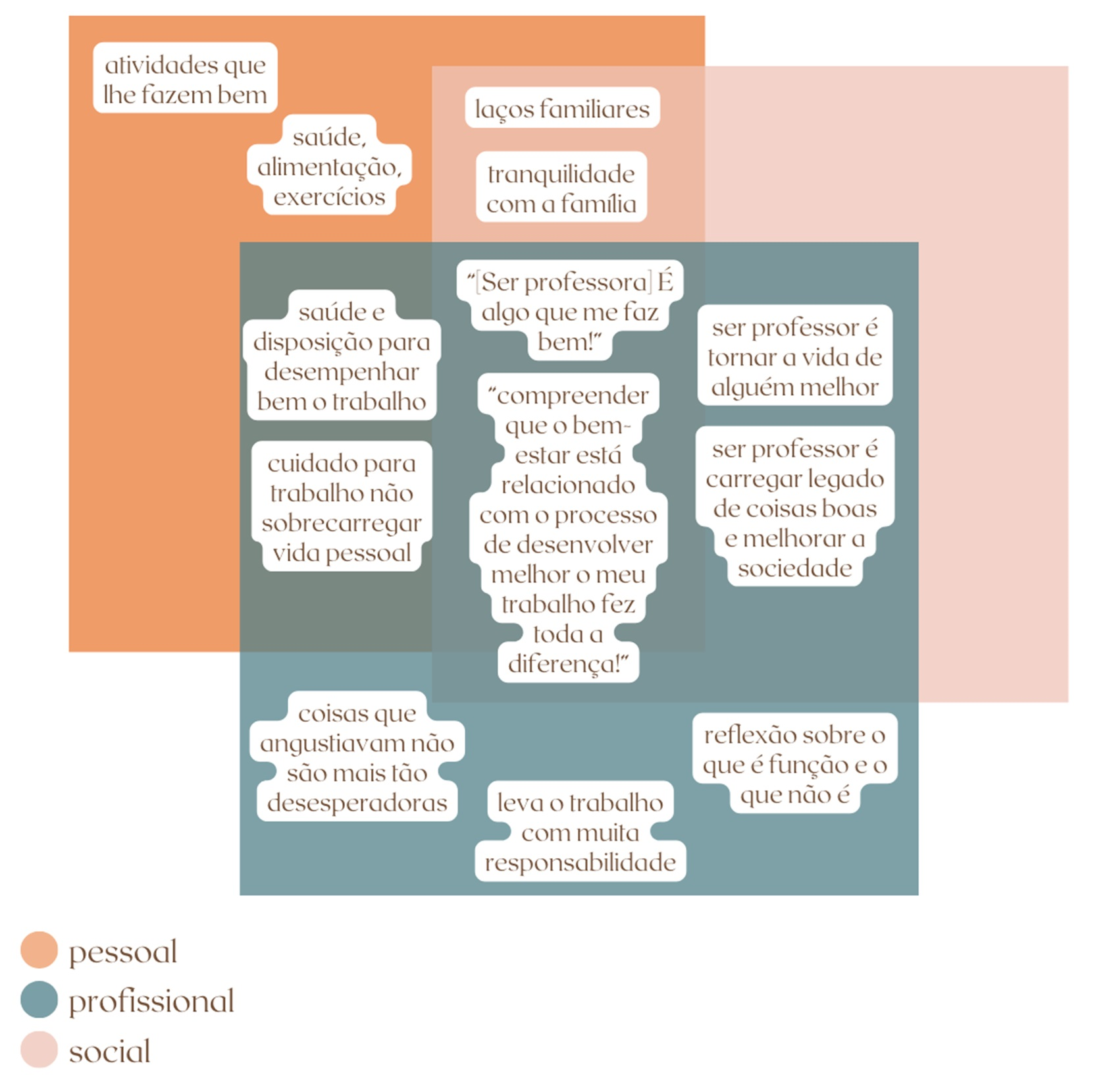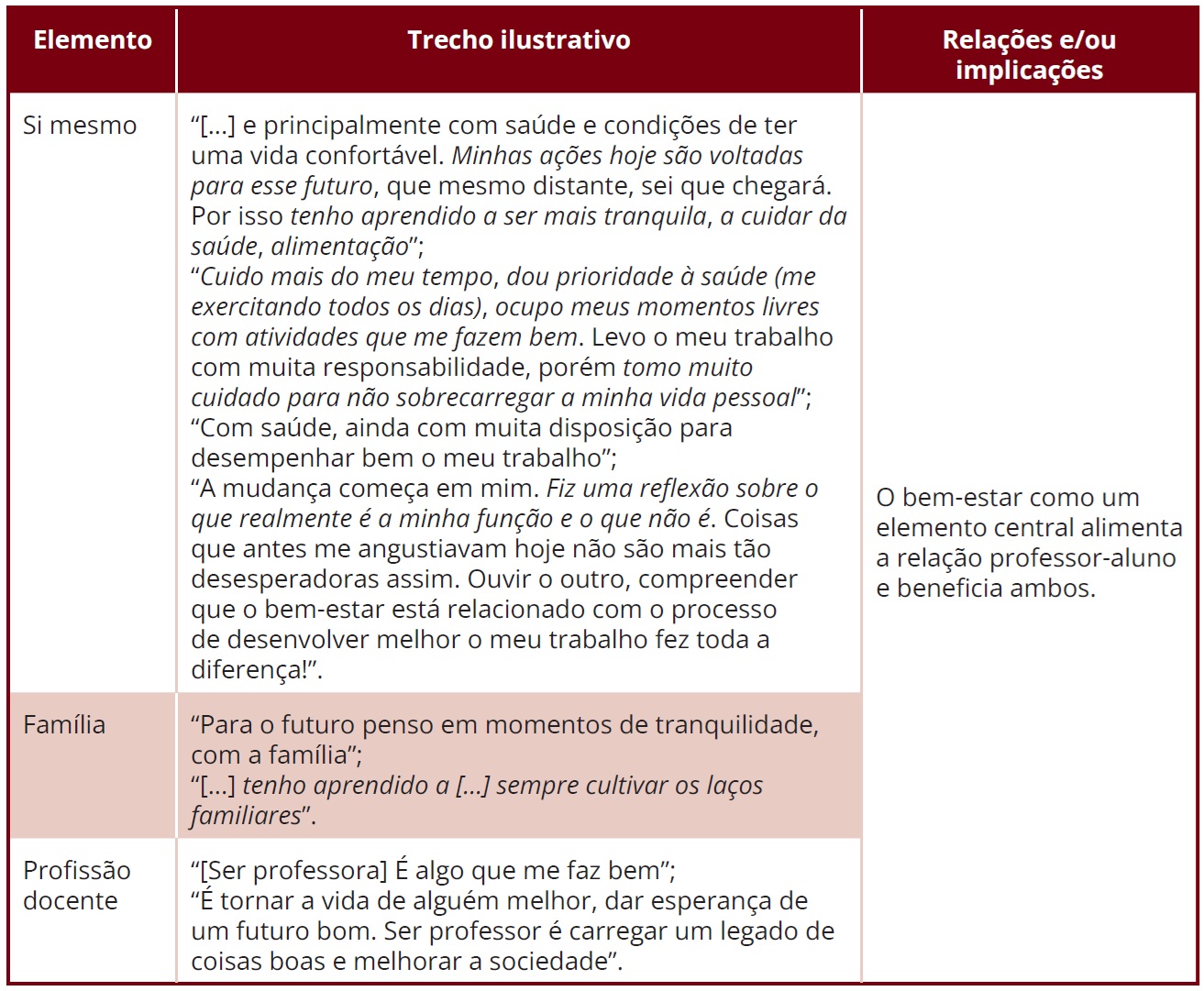 Já pós a formação, no segundo questionário, Anália agrega mais significados a respeito do bem-estar, atingindo o elemento si mesmo (além da família e da profissão docente). Com isso, como citamos anteriormente, ganha destaque a indissociação entre os elementos, em um processo de retroalimentação entre diferentes elementos - si mesmo, família e profissão docente. Em outras palavras, Anália agrega bem-estar nos três elementos, de forma que o bem-estar para si mesma enquanto indivíduo, enquanto membro de uma família e enquanto professora se nutrem mutuamente de forma positiva.