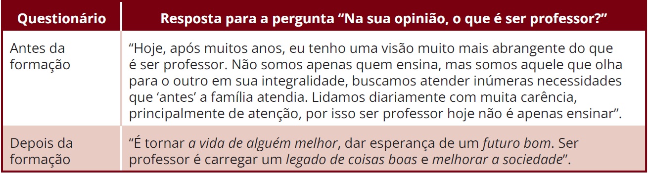 Por fim, tais ressignificações impactaram ainda as representações sobre a docência, indicando, no grupo da formação, o mesmo processo de retroalimentação que destacamos na análise da professora Anália. Com isso, houve, também, uma ressignificação da docência e do papel do professor, com a incorporação de significados voltados a uma educação integral, pautada em uma preocupação com a relação professor versus aluno e com o impacto da educação no bem-estar do aluno também, incluindo, ainda, nas necessidades do professor, a importância de uma busca contínua por aprendizado. Nesse processo, tais ressignificações emergem das vozes dos docentes de forma que cada professor expressa sua singularidade, ao mesmo tempo que há uma dinâmica comum em que significados pessoais, sociais e profissionais extrapolam suas dimensões originais para dar novo sentido às demais dimensões.