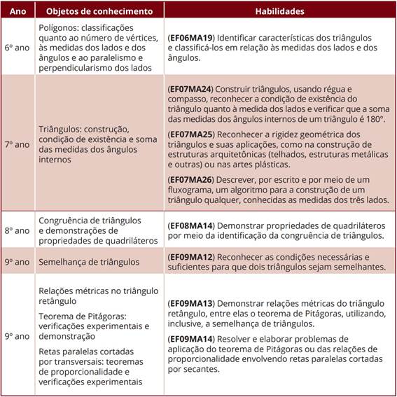 Notamos que há, em todos os anos, pelo menos um objeto de conhecimento e uma habilidade relacionada a triângulos, visto que essa figura geométrica permeia diferentes conceitos e aplicações matemáticas em níveis mais avançados, como a trigonometria no ensino médio e, até mesmo, sua utilização pelos profissionais de áreas diversas. Ao compreenderem, desde o 6º ano, as características dos triângulos, passando por suas diferentes propriedades nos demais anos, os estudantes desenvolvem habilidades de resolução de problemas, raciocínio lógico e compreensão espacial, além de identificarem relações e padrões geométricos (Brasil. MEC, 2018).