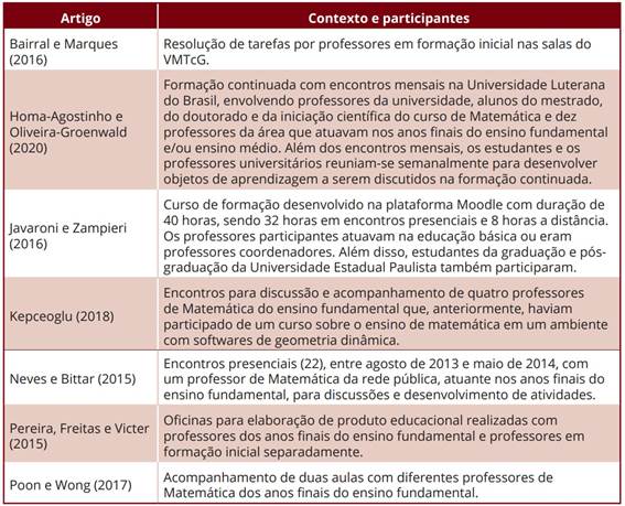 Os contextos variam e incluem cursos de formação, oficinas, resolução de tarefas, encontros para acompanhamentos e discussões, entre outros, com destaque para os encontros virtuais e a resolução de tarefas em ambientes virtuais. Com perspectiva qualitativa, as pesquisas, comumente, utilizam entrevistas, questionários, observações, registros e planejamentos de aulas como instrumentos de produção de dados, os quais são analisados descritivamente.