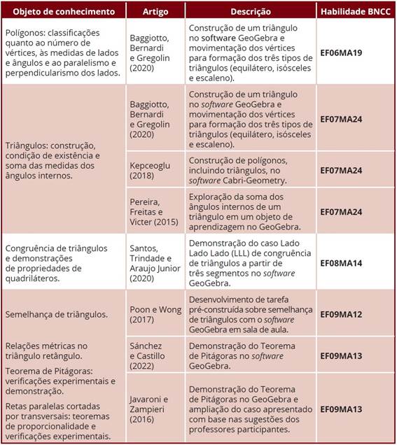 Todos os objetos de conhecimento foram contemplados em pelo menos um dos artigos, com destaque para a construção de triângulos e o Teorema de Pitágoras. Entretanto, nos objetos de conhecimento, nem todas as habilidades foram abordadas nas tarefas: EF07MA25 (rigidez geométrica), EF07MA26 (descrição da construção por meio de fluxogramas e algoritmos) e EF09MA14 (aplicação do Teorema de Pitágoras).