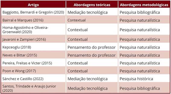 Entre os dez artigos analisados, oito são de autores brasileiros, sendo que sete dessas publicações ocorreram em revistas nacionais. O estudo de Kepceoglu (2018) foi realizado na Turquia e o de Poon e Wong (2017) em Hong Kong. Essas informações diferem de resultados encontrados em outras revisões sistemáticas já empreendidas (Gumiero; Pazuch, 2019, 2020), em que a maioria dos estudos é de países europeus ou dos Estados Unidos da América. Reconhecemos que as escolhas metodológicas, principalmente a base de dados do Latindex, possuem influência nos dados obtidos.