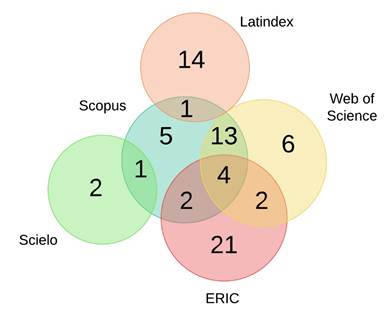 Além desses estudos, outros três artigos encontrados no Latindex foram adicionados por contemplarem a temática, embora não apresentem exatamente os descritores estipulados (Pereira; Freitas; Victer, 2015; Bairral; Marques, 2016; Javaroni; Zampieri, 2016). A Figura 1 traz a distribuição por base de dados, o que facilita a visualização das repetições dos artigos científicos e o total de 71 registros (sem repetição).