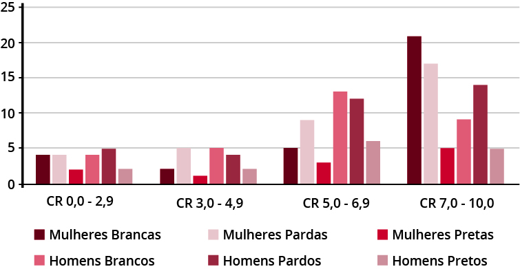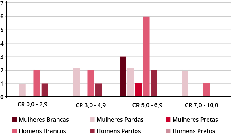 8O rendimento acadêmico ficou estabelecido pelos pesquisadores em quatro subdivisões de Coeficientes de Rendimento (CR): 1) de 0,0 a 2,9 - insuficiência de rendimento e 2) de 3,0 a 4,9 - não corre risco de cancelamento de matrícula, podendo concorrer a bolsas assistenciais (Resolução CEG 09/2018); 3) de 5,0 a 6,9 - a partir de 5,0 considerado CR suficiente para aprovação nas disciplinas e a partir de 6,0 para bolsas acadêmicas (Resolução CEG 04/2004 e Resolução CEG 01/2019) e 4); de 7,0 em diante. Lembramos que, com CR de 8,0 ou mais, poderão ter direito de receber o prêmio de dignidade acadêmica.