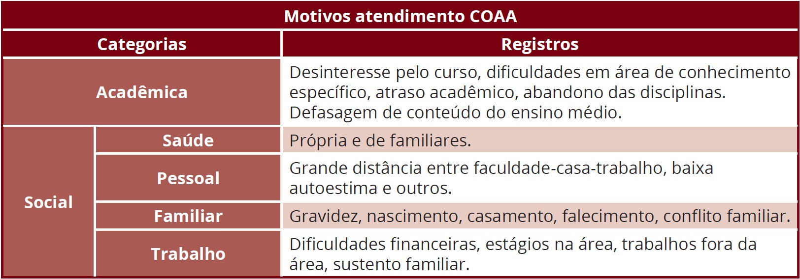 Além disso, custos com passagens, material acadêmico, alimentação, entre outros motivos, são responsáveis em comprometer a regularidade do graduando na universidade (Reis; Gonçalves, 2018). Esses dados, portanto, sugerem-nos, por exemplo, a importância da COAA na manutenção do vínculo estudantil dos cotistas, a fim de que possam concluir ou se manter da melhor maneira possível no curso.