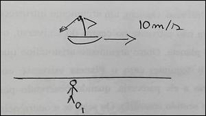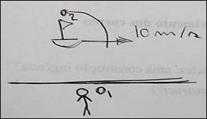 1º Problema: Se o observador O2 abandonar a esfera de chumbo, sendo que a queda da mesma leve um segundo, em que local do navio ela irá cair quando: (considere a aceleração gravitacional no local como 10m/s²).