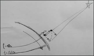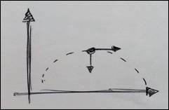 Uma inconsistência identificada está relacionada à trajetória, que segundo o texto e a fala dos acadêmicos é uma parábola completa, todavia, na figura eles representaram apenas meia parábola. É difícil afirmar se esse foi um equívoco conceitual ou uma dificuldade de representação dos acadêmicos, mas de qualquer forma as duas fontes de materiais (escrita e gráfica) se mostram em certa medida inconsistentes.