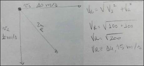 Seguindo a realização do EP, A3 e A4 constroem uma representação coerente em relação a composição dos movimentos vertical e horizontal da esfera como argumento para descrever que sua trajetória em relação a O1 não será igual da descrita em relação a O2. Porém, percebemos falta de clareza no que diz respeito ao formato da trajetória, visto que os estudantes definem apenas as componentes e, consequentemente, a resultante das velocidades, como mostra a Figura 6.