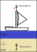 Para O2 a esfera percorrerá uma trajetória reta para baixo (tal como com o barco em repouso), pois como ele se desloca de oeste para leste, a inércia desse movimento sob a esfera resulta na impressão, para O2, de que a esfera não se desloca de oeste para leste com relação a sua posição.