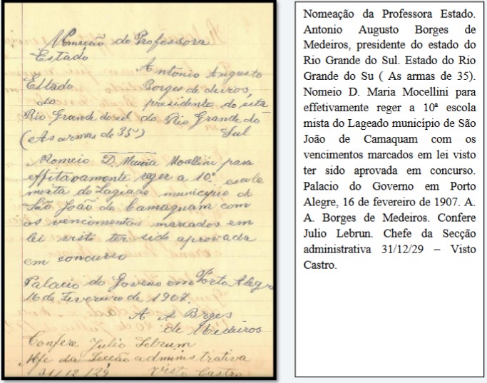 A menina imigrante já tinha tido experiências escolares na Itália. No Brasil, sua escolarização ocorreu em espaços públicos e confessional, chegando a frequentar a Escola Complementar. Interessante destacar que a interrupção na frequência à Escola Complementar não impediu sua nomeação para a docência, visto que concluiu os estudos com aulas particulares com o Professor Emilio Meyer. Maria Mocelini prestou concurso para professora estadual e foi nomeada em 1907. O documento de nomeação é o último no conjunto dos que são transcritos pela professora, como podemos ver na figura a seguir: