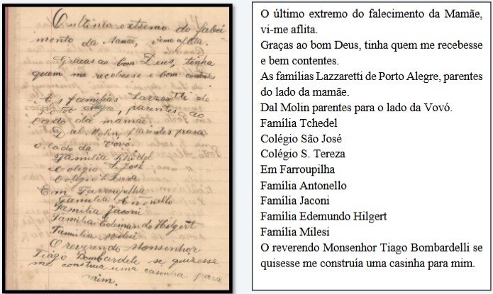 Neste excerto, podemos auferir que a família vive os primeiros anos na capital, Porto Alegre. Católicos, a vinculação religiosa da família com a Igreja é destacada, porque Maria se preocupa em registrar o agradecimento a Jesus pela boa viagem. Além disso, observa-se que o pai da professora também teve uma vinculação com a educação trabalhando no asilo de mendigos e Colégio de Orfãos Santa Tereza. O pai, Sebastião Mocelini, naturalizou-se brasileiro e alistou-se como eleitor em 1902, aos 55 anos (Jornal ‘A Federação’, 04/08/1902, p. 4).