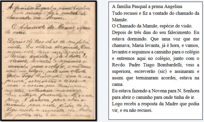 Apesar dos convites, em “dias aflitos”, ela recorre a crença para tomar a decisão para onde iria e escreve quase uma experiência mística em que a mãe em um sonho lhe indicará o melhor caminho. A partir de então, quando do aceite da Madre Superiora da Congregação das Irmãs Scalabrinianas de São Carlos Borromeo, vai residir junto a essa comunidade. Descreve que se sentia contemplada em suas necessidades de “corpo e alma”. Novamente, a representação do valor da sociabilidade em meio às práticas do catolicismo.