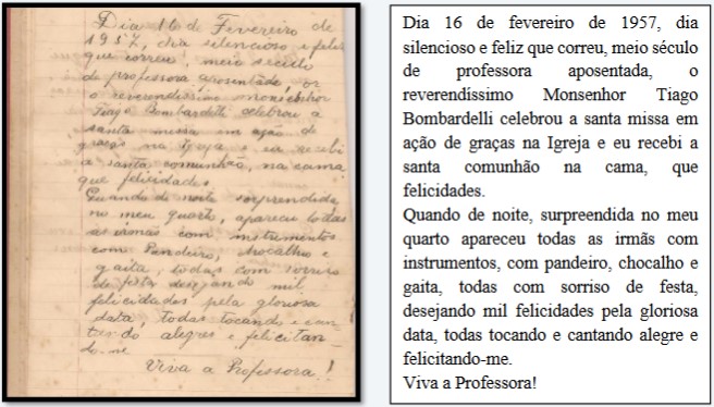 As celebrações destacadas pela professora, junto as irmãs, são duas: a) a comemoração de seus 80 anos de vida; e b) a comemoração de seus cinquenta anos de professora (1907-1957), representado por ela como momentos carinhosamente celebrados. A título de exemplo, apresentamos a escrita da comemoração do aniversário dos cinquenta anos da professora: