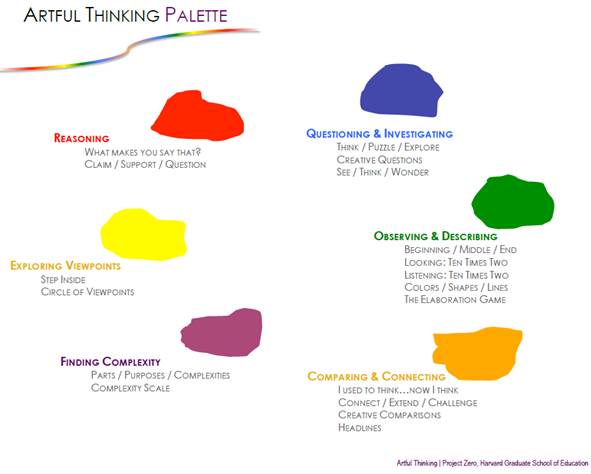 Tendo em vista padrões poderosos de comportamento intelectual para explorar e apreciar obras de arte (e igualmente potentes em termos de construir o entendimento em outras disciplinas), o projeto Artful Thinking elegeu seis disposições de pensamento como foco: 1) raciocinar; 2) explorar pontos de vista; 3) encontrar complexidade; 4) comparar e conectar; 5) questionar & investigar; e 6) observar e descrever. Para enfatizar o caráter sinérgico desse conjunto de disposições, elas são apresentadas na forma de uma paleta de tintas (Figura 1).