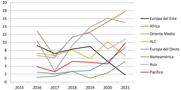 El caso de la Región Pacifico es emblemático. En 2021, período en el cual se recogen los datos del año de la pandemia, esa región reflejó un incremento de 5.2 puntos porcentuales con respecto al año anterior. Fue la región que mayor incremento obtuvo. Suponemos que durante ese año el esfuerzo invertido para conseguir la cura del COVID19, aceleró el trabajo de los equipos de investigación en el área de la salud. África, Europa del Oeste, Asia y Norteamérica.