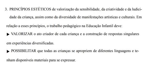 Entretanto, nos questionamos se, quanto aos Princípios Estéticos, apenas os verbos valorizar e possibilitar dariam conta de abarcar sua complexidade, posto que antes da valorização se configura a necessidade de seu estímulo e promoção, entendendo que tais ações exigem um olhar atento a provocações que despertem possibilidades diversas, singulares e refletidas.