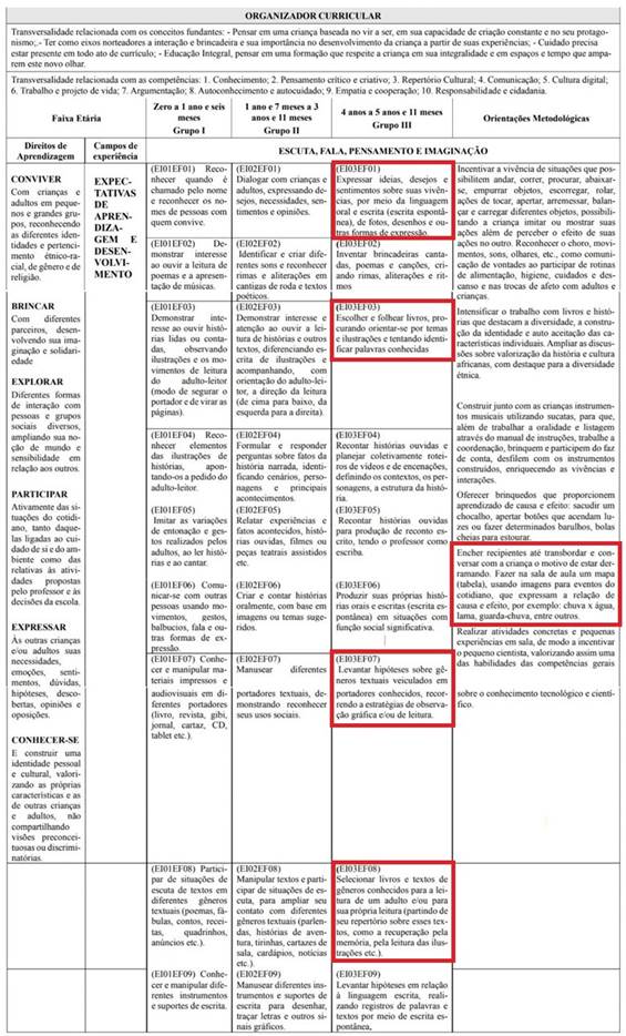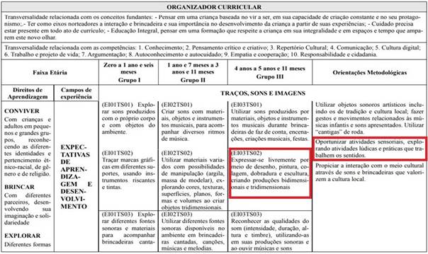 Na organização curricular, disposta em forma de quadros, são apresentadas as transversalidades relacionadas com os conceitos fundantes e com as competências, ou seja, temas que devem perpassar por todos os momentos vivenciados na instituição, bem como os Direitos de Aprendizagem, os Campos de Experiência, como postos na BNCC, as Expectativas de Aprendizagem e Desenvolvimento, intitulados na BNCC como Objetivos de Aprendizagem e Desenvolvimento, divididos por faixa etária, acrescidos do campo Orientações Metodológicas, em que são apresentadas sugestões de ações que contemplariam o alcance das aprendizagens propostas.
