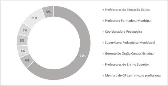 Com a realização do primeiro momento de leitura, considerando os critérios de inclusão e exclusão estabelecidos, foram selecionados 19 trabalhos que compuseram o conjunto de estudos analisados no segundo momento. Na análise inicial desses estudos emergiram duas questões importantes. A primeira questão diz respeito ao perfil dos pesquisadores autores dos estudos (Gráfico 1). Nesse sentido, é possível observar a proeminente participação das professoras que atuam na Educação Básica (63%) no desenvolvimento implicado dos processos de pesquisa dentro do conjunto analisado.