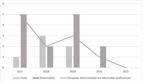 Os descritores utilizados na busca combinada com os operadores foram formação continuada, formação contínua, formação continuada de professores, formação contínua de professores, experiência docente e experiência profissional. A busca inicial retornou com 2.303 resultados. Esses resultados foram filtrados, derivando um conjunto circunscrito à grande área Ciências Humanas, à área do conhecimento Educação e ao período de cinco anos, compreendendo trabalhos defendidos entre 2017 e 2021. Com a aplicação dos filtros foram obtidos 127 trabalhos, compreendendo 106 dissertações e 21 teses distribuídas no período delimitado (Tabela 1), cuja produção envolve 16 programas de pós-graduação situados em 14 instituições brasileiras.
