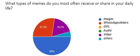 Based on the data collected in the experience described in this study, it was possible to infer that in the everyday social practices of pre-service teachers, as shown in Figure 1, there is a substantial appropriation of memes in the image format. Specifically, 50% of the research participants reported that image-based memes are integrated into their daily communicational dynamics. This can be explained by the predominance of memes in this format, which shape public debate through captioned images, often summarizing and simplifying discourses and narratives in instant messaging applications and social media timelines.