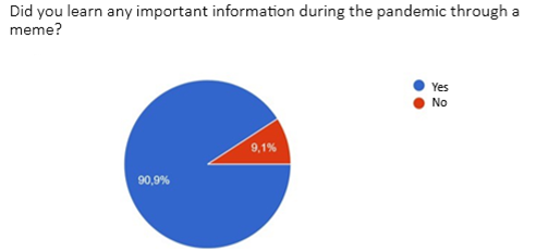 When further asked about memes as mediators of access to information, 90.9% of the students involved in the formative process in question responded (Figure 3) that the language of memes mediated, in some way, their access to information during the pandemic in 2020 and 2021. The results indicated an increased role of memes in the communicational landscape, reverberating themes across different domains and socio-materializing narratives in circulation across multiple topics that affected the prevailing social order. The data also suggest the role of memes in simplifying discourses through humor, creating a locus of information in both the political sphere and in debates about public health and scientific knowledge, as exemplified during the pandemic.
