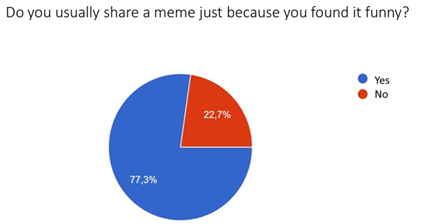 When asked whether they usually share memes solely for their comedic effect (Figure 4), 77.3% answered yes, while only 22.7% responded no. These data point to what may be the primary characteristic of meme culture: its comedic potential and ability to generate humorous experiences, articulated through different formats of authorship, playfulness, and laughter.