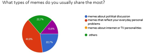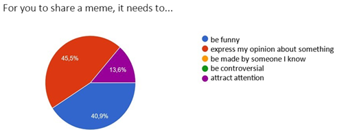 Beyond the comedic effect and the laughable aesthetic mobilized by memes, the data presented in Figure 5 indicate that memes also function as translators of contexts, since 45.5% of participants reported sharing memes that reflect their opinions, while 40.9% said they share memes solely for being funny. In other words, these are different ways of digitally materializing their interests, meanings, and worldviews within the digital environment.