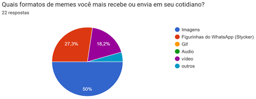 A partir dos dados coletados na experiência descrita neste trabalho, foi possível inferir que nas práticas sociais cotidianas de docentes em formação inicial, conforme aponta a Figura 1, há uma grande apropriação de memes no formato de imagens. Dado que, 50% dos participantes da pesquisa, responderam que os memes em formato de imagens integram sua dinâmica comunicacional cotidiana. Isso pode se justificar pela predominância de memes neste formato, que compõem o debate público a partir de imagens legendadas, quase sempre sintetizando e simplificando discursos e enredos em aplicativos de mensagens instantâneas e ‘linhas do tempo’ de mídias sociais.
