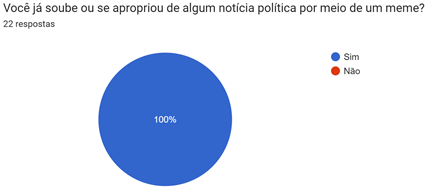 Quando indagados se já souberam ou se apropriaram de alguma notícia política por meio de memes, as respostas indicaram uma totalidade da mediação comunicacional dos memes (Figura 2) no processo de comunicação e disseminação de notícias políticas. São dados que apontam para uma tendência de comunicação política mediada por memes, ressignificadas pela brincadeira on-line, e pela ludicidade discursiva, mas que tendem a aproximar sociedade e esfera política, a partir de brincadeiras carregadas de ideologias e sentidos, mas também produzindo um ambiente de militância, persuasão e engajamento coletivo.