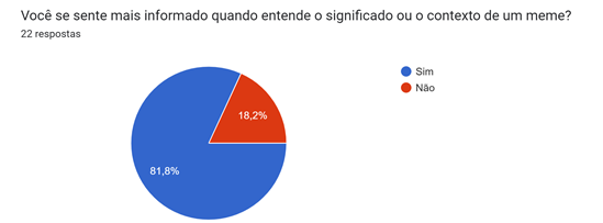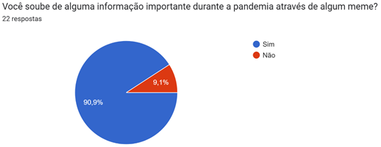 Ainda indagados sobre memes enquanto mediadores do acesso à informação, 90,9% dos estudantes inseridos no processo formativo em questão, responderam (Figura 3) que a linguagem dos memes mediou a de alguma forma seu acesso à informação durante a pandemia, em 2020 e 2021. Os resultados indicaram uma maior atuação dos memes no cenário comunicacional, reverberando temas de diferentes ordens e sociomaterializando narrativas em propagação a partir de múltiplos assuntos que afetaram a ordem social vigente. Os dados inferem ainda para o lugar de simplificação de discursos que a comicidade dos memes podem produzir, ao criar um lócus de informação seja na esfera política ou no debate sobre saúde pública e conhecimento científico, como foi o caso da pandemia.
