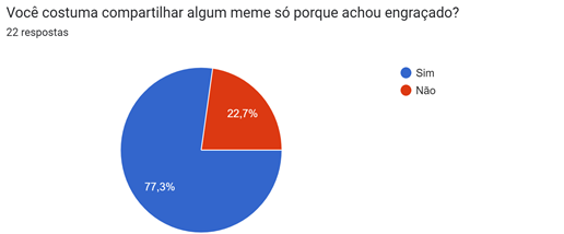 Quando questionados se costumam compartilhar memes apenas pelo efeito cômico (Figura 4), 77,3% afirmaram que sim e apenas 22,7% disseram que não. Estes dados apontam para o que talvez possa ser a principal característica da cultura dos memes: seu potencial cômico e de produção de experiências de humor, articulado por diferentes formatos de autoria, ludicidade e riso.
