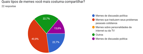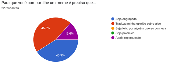 Para além do efeito cômico e da estética risível que é mobilizada pelos memes, os dados apresentados na Figura 5, nos indicam que os memes funcionam também como tradutores de contextos, uma vez que 45,5% afirmaram que compartilham memes que traduzam suas opiniões, enquanto 40,9% disseram que compartilham memes apenas por serem engraçados. Ou seja, são diferentes formas de materializar digitalmente seus interesses, seus sentidos e suas visões de mundo no ambiente digital.