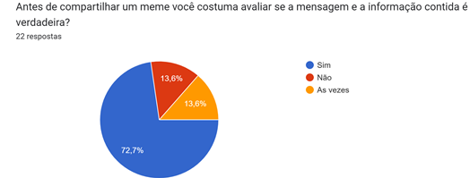 Quando indagados sobre avaliação da veracidade da mensagem em propagação em memes compartilhados em suas práticas cotidianas (Figura 6), 72,7% afirmaram que checam a origem e veracidade das informações. Já 13,6% afirmaram que não, e outros 13,6% disseram que às vezes checam. No entanto, é possível avaliar que estas questões se relacionam, muitas vezes, aos regimes de crenças e não necessariamente à produção de verdades factuais. Ao passo que, muitos memes em circulação são produzidos para se associar ao campo discursivo e subjetivo de muitos sujeitos, mesmo que desarticulados da veracidade. O que possibilita um lócus de disputa de narrativas sobre o que é a verdade, a partir da linguagem de memes, especialmente na esfera política.