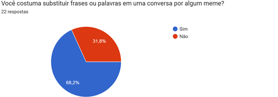 Não obstante, os memes, funcionam, para maioria dos sujeitos como modos de representações que sintetizam suas intencionalidades, sentimentos e modos de dizer na comunicação cotidiana. Os dados da Figura 8 indicam que 68,2% dos participantes da pesquisa substituem frases e palavras por memes. Os dados apontam também para a importância de se reconhecer o papel crescente dos memes enquanto linguagem que vai além das mídias sociais e consequentemente para a necessidade de se mobilizar estratégias didáticas a essa dinâmica comunicacional, reconhecendo, suas limitações, bem como, necessidades de problematização crítica e reflexiva.