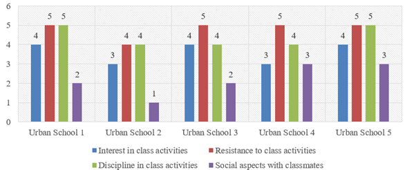 The observation results of the performance of 5 schools in the urban area and 5 schools in the rural area are based on the four specified evaluative dimensions. These dimensions may encompass aspects such as Interest in class activities, Discipline in class activities, Resistance to class activities, and Social Aspects with classmates. Scores for each dimension are adjusted to a scale of 1-5, with 1 indicating the lowest performance and 5 indicating the highest performance. The tabulated data results of the observation sheet scores for each dimension can be seen in the following discussion: