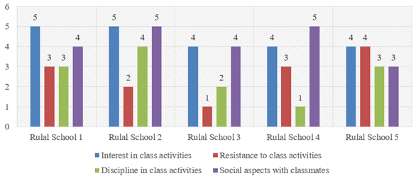 Figure 2 shows that rural schools have an advantage in the dimensions of interest and social aspects when conducting activities in the classroom. Students in rural schools demonstrate a more interested attitude in what will be done in class and are more cooperative with peers in a group when working on assignments given by the teacher. To reinforce this data, the transcript results of interviews with 5 teachers in rural schools are as follows: