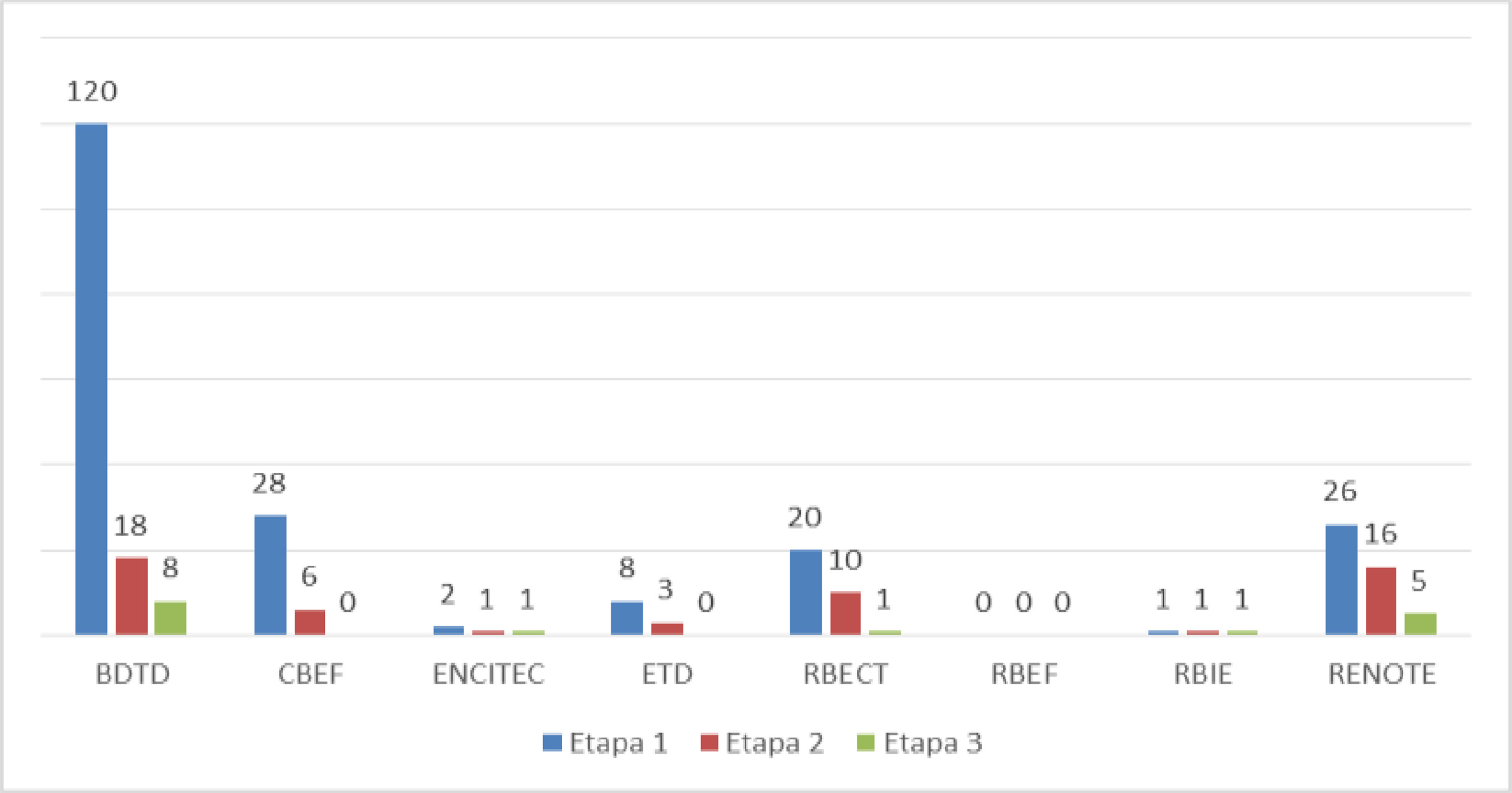 Na primeira etapa (Etapa 1), buscamos os textos nos periódicos previamente selecionados. Como resultado inicial, foram encontrados um total de 205 trabalhos, entre artigos, teses e dissertações. Os números específicos de trabalhos para cada banco de dados são mostrados na tabela 1, bem como os Gráficos para as etapas de pesquisa realizadas na primeira busca conforme string de pesquisa: