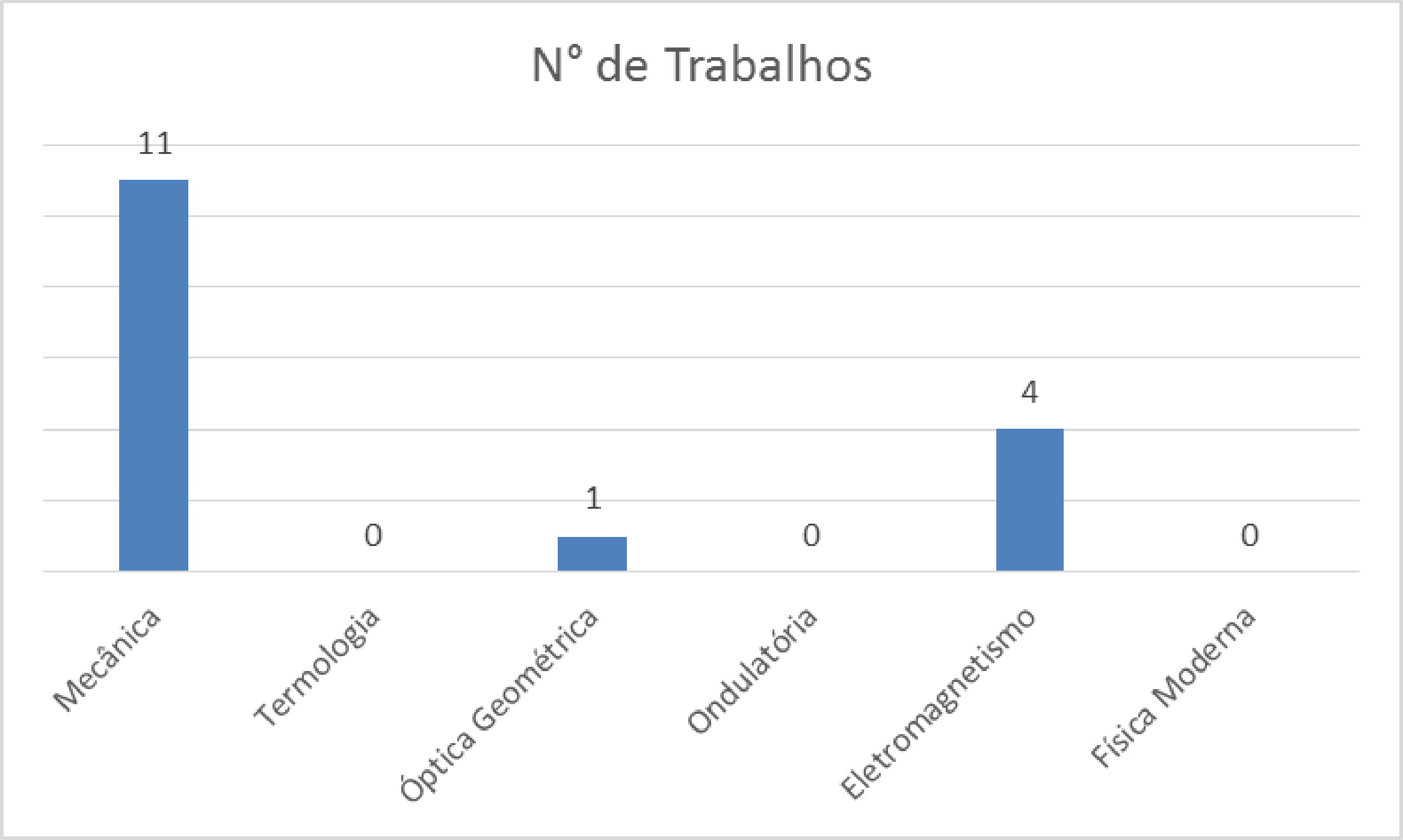 Podemos verificar, assim, uma forte concentração de trabalhos de Mecânica. Aqui, faz sentido especularmos sobre esse importante resultado. É de conhecimento da área de EF, tanto por docentes como por especialistas, a grande ênfase dada para o estudo da mecânica. Diversos são os trabalhos que mostram concentração específica nessa grande área de EF, somado ao longo período de estudos na educação básica. Como podíamos imaginar, este trabalho traz resultados que não destoam dos outros. Uma massiva concentração e uma ausência considerável de trabalhos em outras temáticas, abrindo espaços para o desenvolvimento de recursos e trabalhos nessas áreas, sendo um desdobramento claro aos resultados apontados aqui neste artigo.