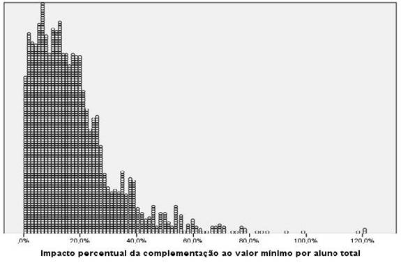 No histograma, é possível observar que a maioria dos casos, 1362 municípios, terão menos de 20% de impacto na média do VAAT com a complementação de recursos. Todavia, 138 casos terão uma ampliação de mais de 40% do VAAT com o aporte de recursos, todos da Região Nordeste, exceto três municípios da Região Norte do Brasil. Em geral, nos municípios dos estados das regiões Norte e Nordeste o aumento do VAAT foi percentualmente maior, com destaque aos estados do Maranhão, Alagoas, Piauí, Amazonas, Pará, Ceará, Paraíba e Bahia.