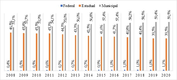 Gráfico 2 Percentual de matrículas exclusivamente públicas por dependência administrativa - 2008-2020