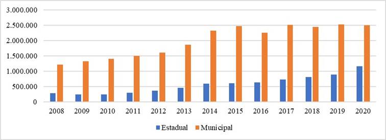 Gráfico 3 Quantitativo de matrículas atendidas em tempo integral dos municípios e estados brasileiros - 2008-2020