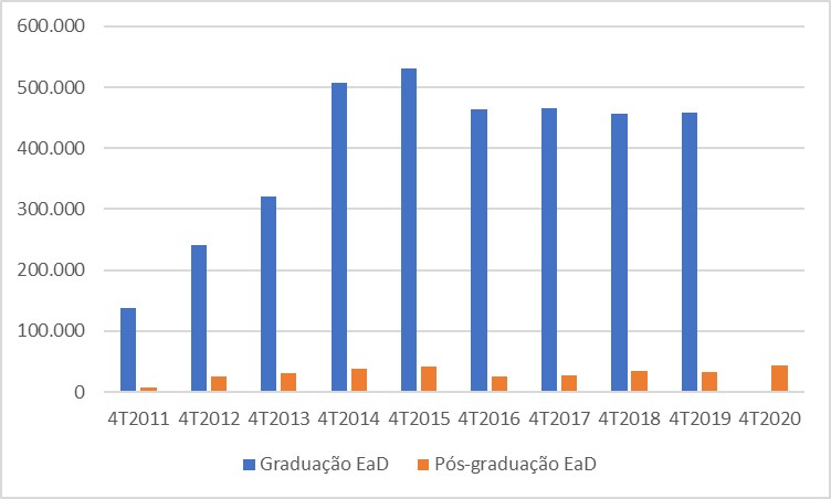 De acordo com o Gráfico 1, podemos notar a expansão da graduação a distância, que, entre o quarto trimestre de 2011 e 2019, apresentou um crescimento de 233,97%. A pós-graduação, por sua vez, evidenciou oscilações, contudo apresentou um crescimento de 364,50%, considerando o mesmo período.