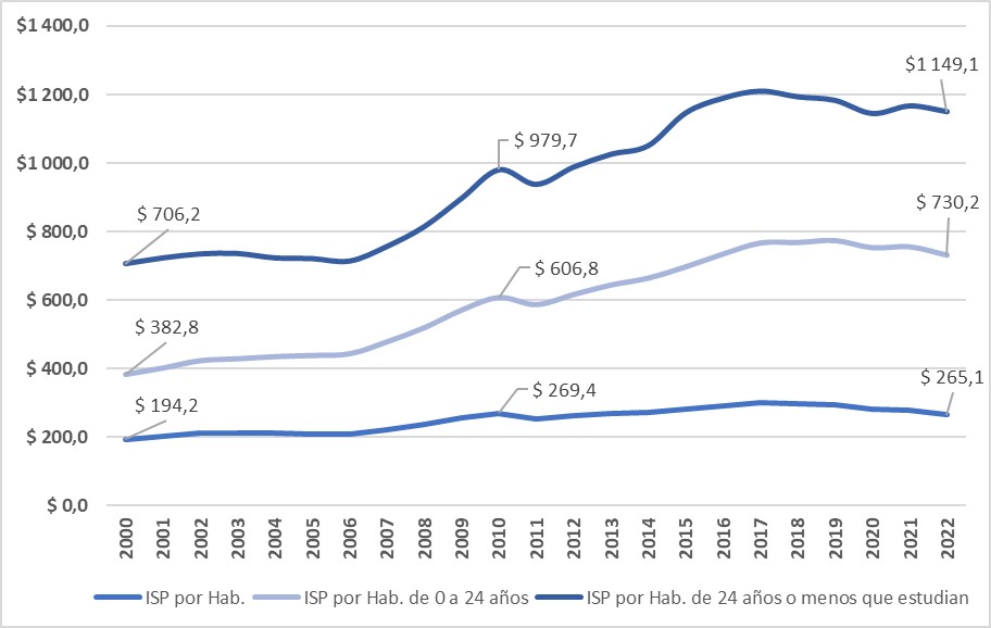 Esta inversión beneficia mayoritariamente la población de 24 años o menos que estudia y de manera significativamente baja en comparación a esta cifra está la ISP en general por habitante que se explica en una relación para el 2022 de $1149,1 a $265,1 respectivamente. Si se incluye en el análisis a la población de 0 a 24 sin que medie la variable de estudio, la inversión aumenta casi en más del 200% respecto de la inversión social dirigida a la población nacional (Gráfico 2).