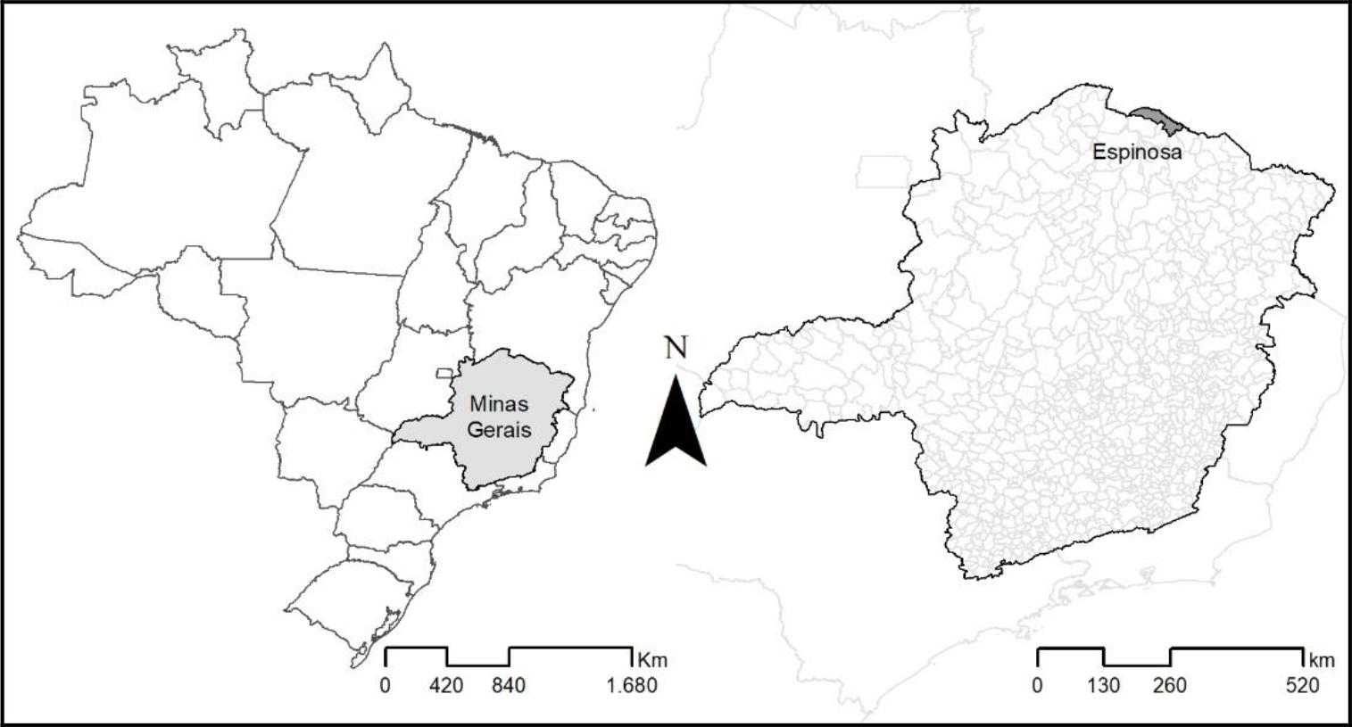 O município de Espinosa, conforme Figura 1, está localizado na região norte de Minas Gerais, a aproximadamente 690 km de Belo Horizonte, capital do Estado.