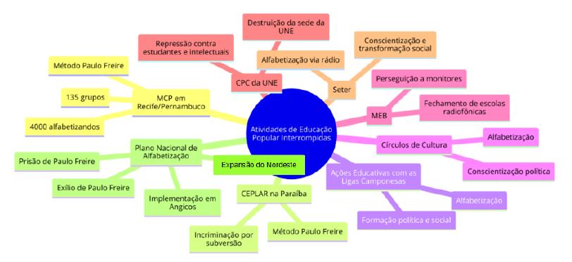 Diversas atividades de Educação Popular foram perseguidas ou interrompidas devido à ditadura civil-militar. O Movimento de Cultura Popular (MCP) em Recife, que utilizava o Método Paulo Freire, foi extinto em abril de 1964, afetando cerca de 4.000 alfabetizandos em 135 grupos (Scocuglia, 2018). A Campanha de Educação Popular (CEPLAR) na Paraíba, também baseada no Método Paulo Freire, foi encerrada abruptamente (Porto & Lage, 1994), e seus dirigentes foram perseguidos sob a acusação de subversão comunista (Scocuglia, 2003; 2018). As atividades educativas associadas às Ligas Camponesas, que envolviam alfabetização e formação política, foram fortemente reprimidas após o golpe, assim como os Círculos de Cultura, que promoviam a conscientização política por meio de discussões grupais (Scocuglia, 2018).