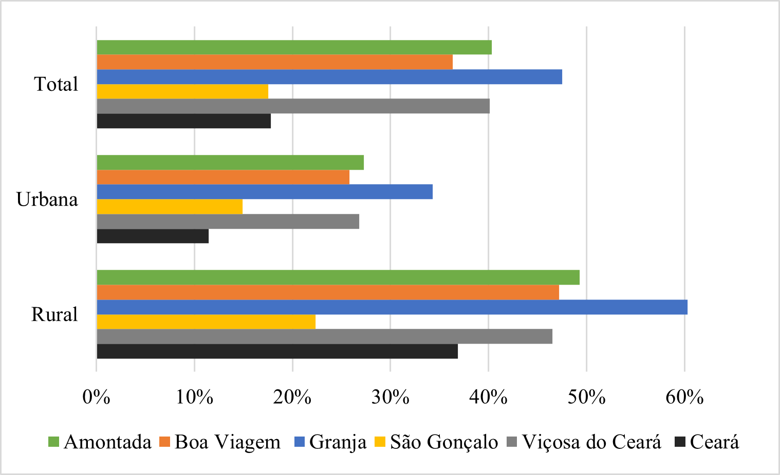 No que tange às condições socioeconômicas, ao analisar os dados do último censo realizado (2010) em relação à população extremamente pobre (renda per capita até R$70,00) dos municípios da amostra, apenas São Gonçalo do Amarante possui índice menor que a média estadual (17,78%), com 17,52% de sua população na extrema pobreza (8 mil habitantes). A taxa é maior na zona rural do município, chegando a 22,34%. O maior índice é o de Granja, com 47,49% da população vivendo nessa faixa econômica, aproximadamente 25 mil pessoas. A situação da zona rural é ainda mais grave, uma vez que 60,28% da população é extremamente pobre, conforme nos informa o Gráfico 1.