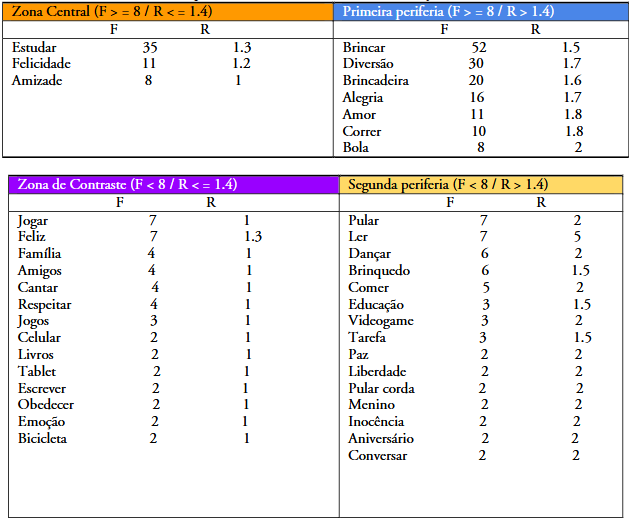 Essas palavras constituintes da zona central – estudar, felicidade e amizade – parecem retratar elementos normativos, já que compõem uma dimensão social e estão diretamente conectadas ao sistema de valor de cada indivíduo (Abric, 2003). Afirmações como criança tem que estudar, criança tem que ser feliz e crianças têm que ter amigos elucidam melhor a normatividade desses termos.