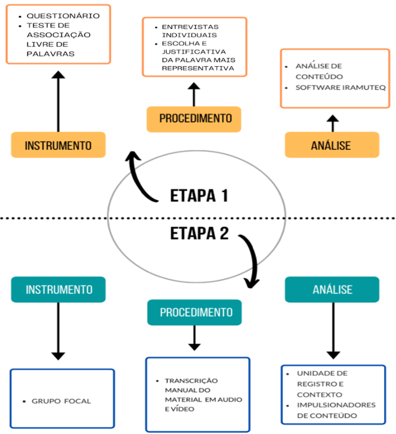 O itinerário metodológico se constituiu em duas etapas, em que uma serviu de subsídio para organização do roteiro da etapa seguinte. Diferentes instrumentos utilizados em cada etapa permitiram o acesso aos sentidos que circulam em torno da infância, analisando como eles são construídos e organizados no atual contexto social, marcado pela presença da tecnologia digital da informação. Assim, os procedimentos envolveram testes de associação livre de palavras, entrevistas e grupo focal. Cada etapa com seu instrumento, procedimentos e análise estão apresentados na Figura 1. Vale ressaltar que todas as etapas foram iniciadas e concluídas antes da pandemia.