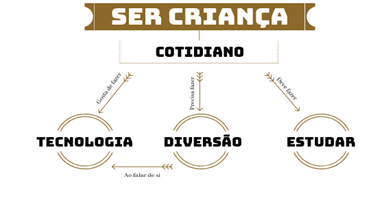 Corroborando os dados construídos na primeira etapa – em que os aparatos digitais apareceram apenas na zona periférica da estrutura da representação na análise prototípica –, os resultados obtidos aqui trazem o cotidiano como elemento funcional do discurso. Isto é, ao pensarem sobre o que é ser criança, os participantes elencam particularidades daquilo que vivenciam e, a partir desse processo, constroem seus conceitos e definições acerca de si. Por conseguinte, construímos um diagrama no qual é possível visualizar como se estabelecem essas construções (Figura 2).