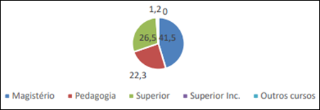 Identifica-se, portanto, que uma grande quantidade de professores, os seja, 41,5 % possuem o curso normal e apenas 22,5% possuem o curso de Pedagogia, que se compreende, seria o curso de formação adequado para o atendimento das séries iniciais.